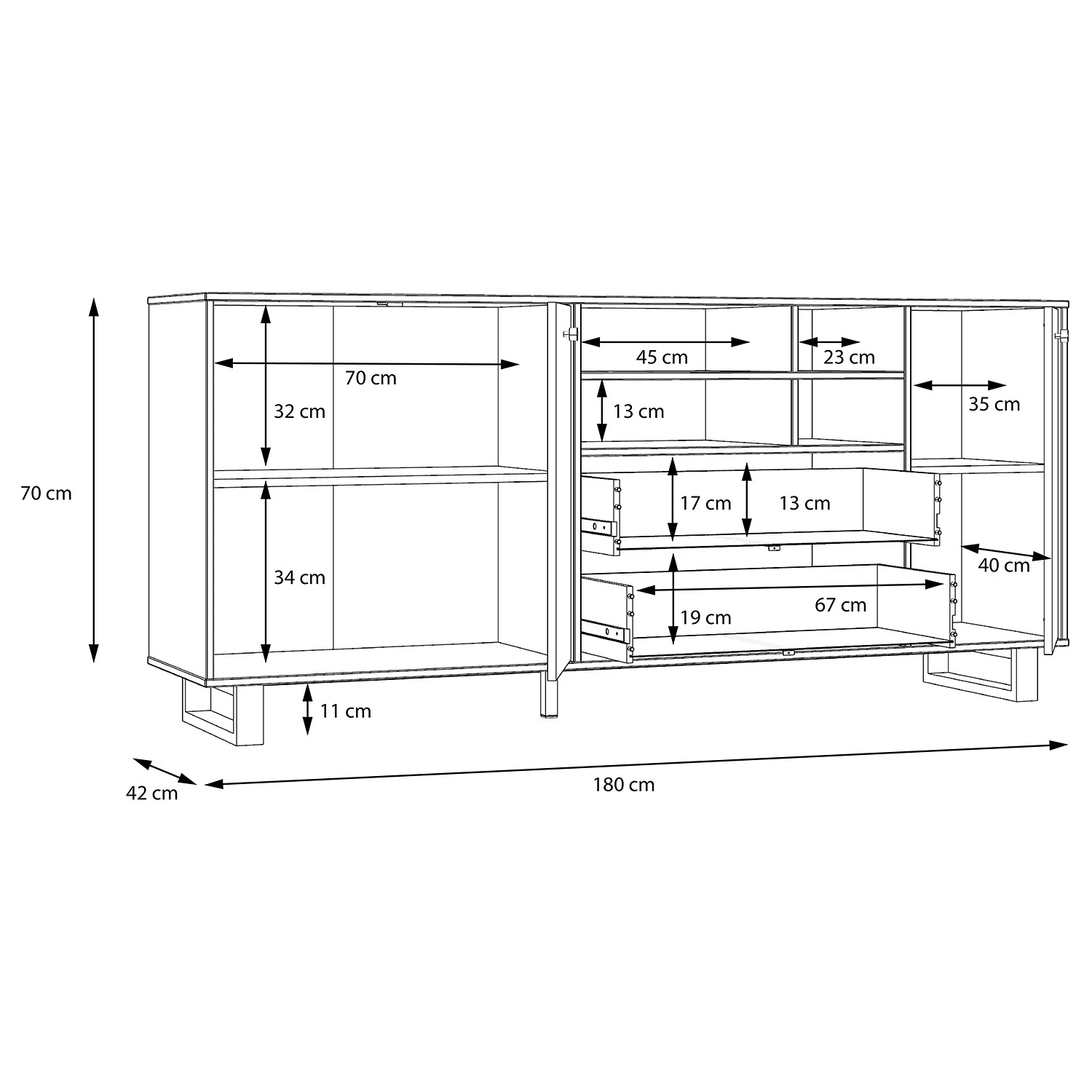 - Compartiments ouverts : 45 x 13 x 35 cm / 23 x 13 x 35 cm