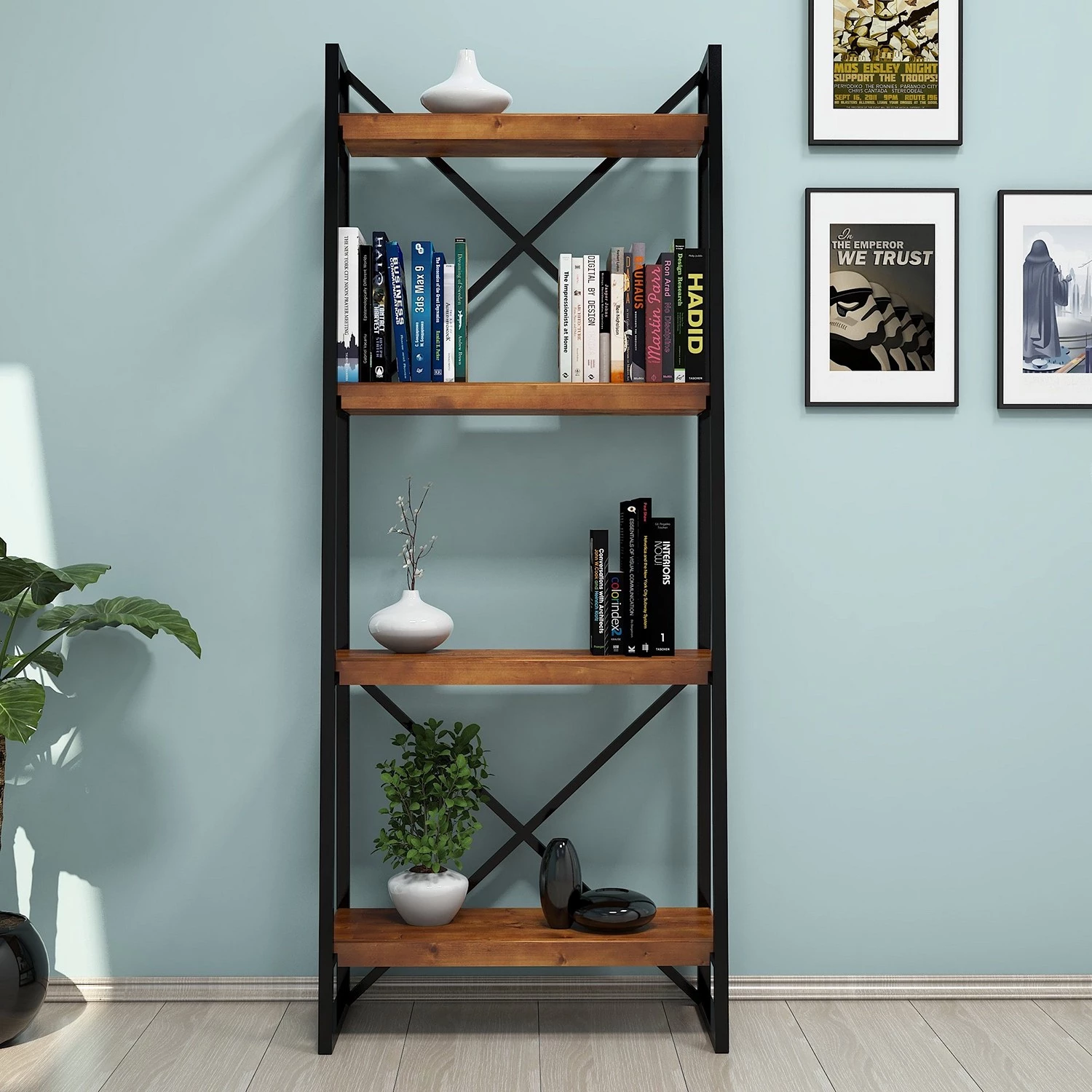 - Étagères : pin massif verni