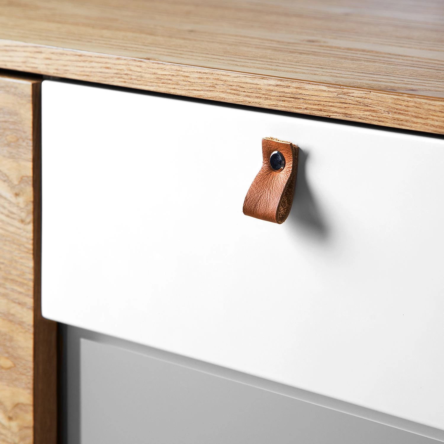 - Façade des tiroirs et éléments décoratifs : blanc mat
